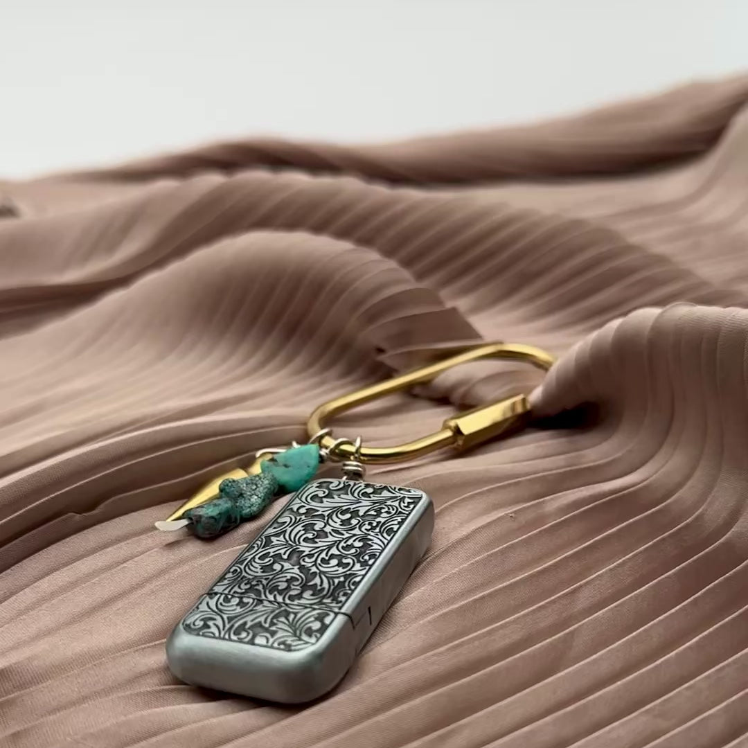 This statement purse charm features a filigree-inlay lighter, three genuine turquoise nugget beads, and a faux bullet. Designed to clip easily onto your favorite bag, keys, or belt loop!
