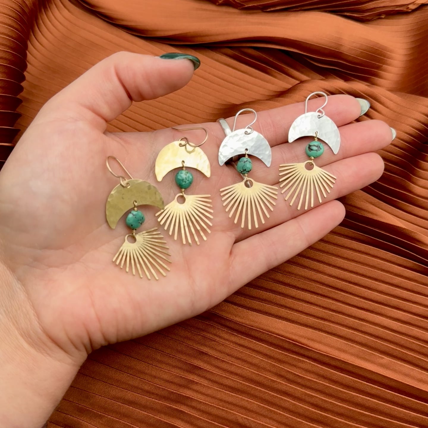 Gold or silver moon & burst pendants with a Turquoise bead that hangs from 14 karat gold filled or sterling silver ear wire.