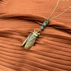 The Stone Wing Necklace celebrates transformation, renewal, and timeless beauty. This vintage-inspired cicada pendant in warm, golden brass hangs beneath three genuine turquoise beads, adding a touch of color and character to its classic brass design.