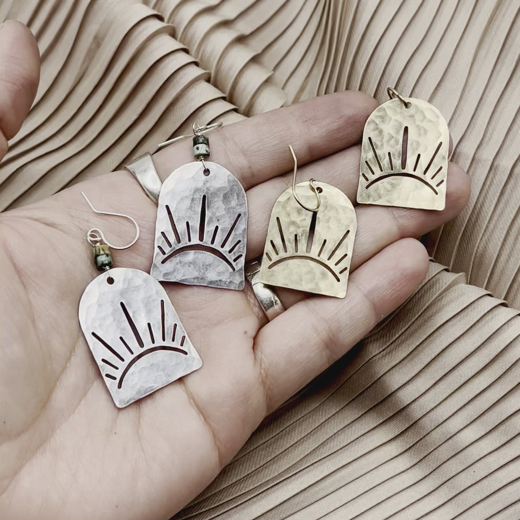 Ear wires and necklace chains are hypoallergenic and are sterling silver or 14 karat gold filled. Gold and silver pendant pieces are made of raw brass or sterling silver plated brass and can be polished the same as all other precious metals.