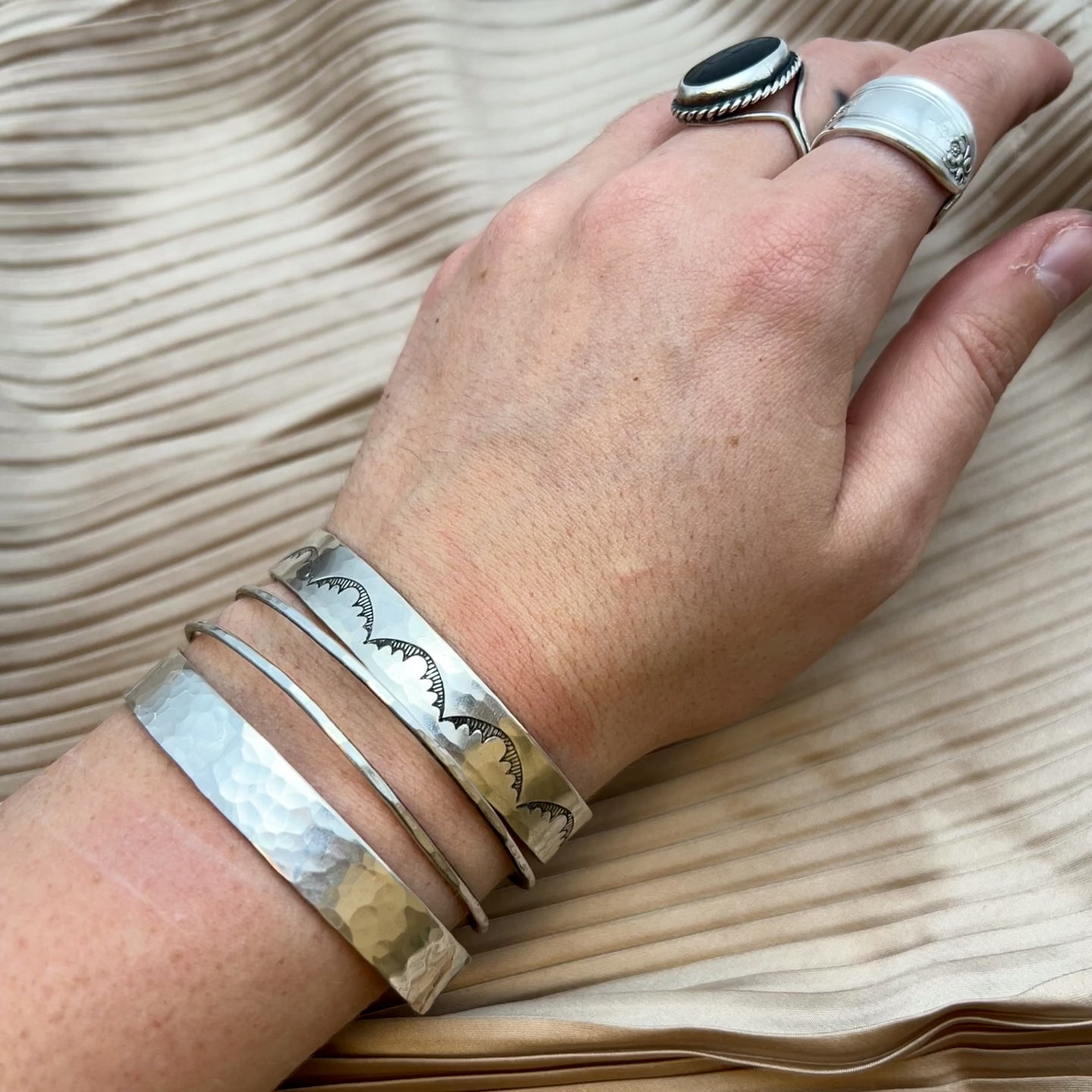 Material Note: Our cuffs are crafted from raw jeweler’s brass and sterling silver–plated brass. Because raw brass naturally interacts with each person’s unique skin chemistry, reactions can vary—some wearers will enjoy a lasting shine with no change, while others may notice a temporary green tint where the cuff touches their skin. This is a normal and harmless reaction that depends on your body’s pH.