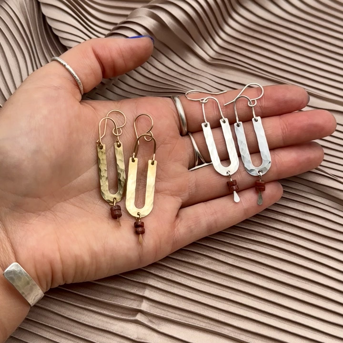 Textured gold or silver arched pieces with Red Jasper heishi beads dangle from 14k gold filled or sterling silver ear wire.