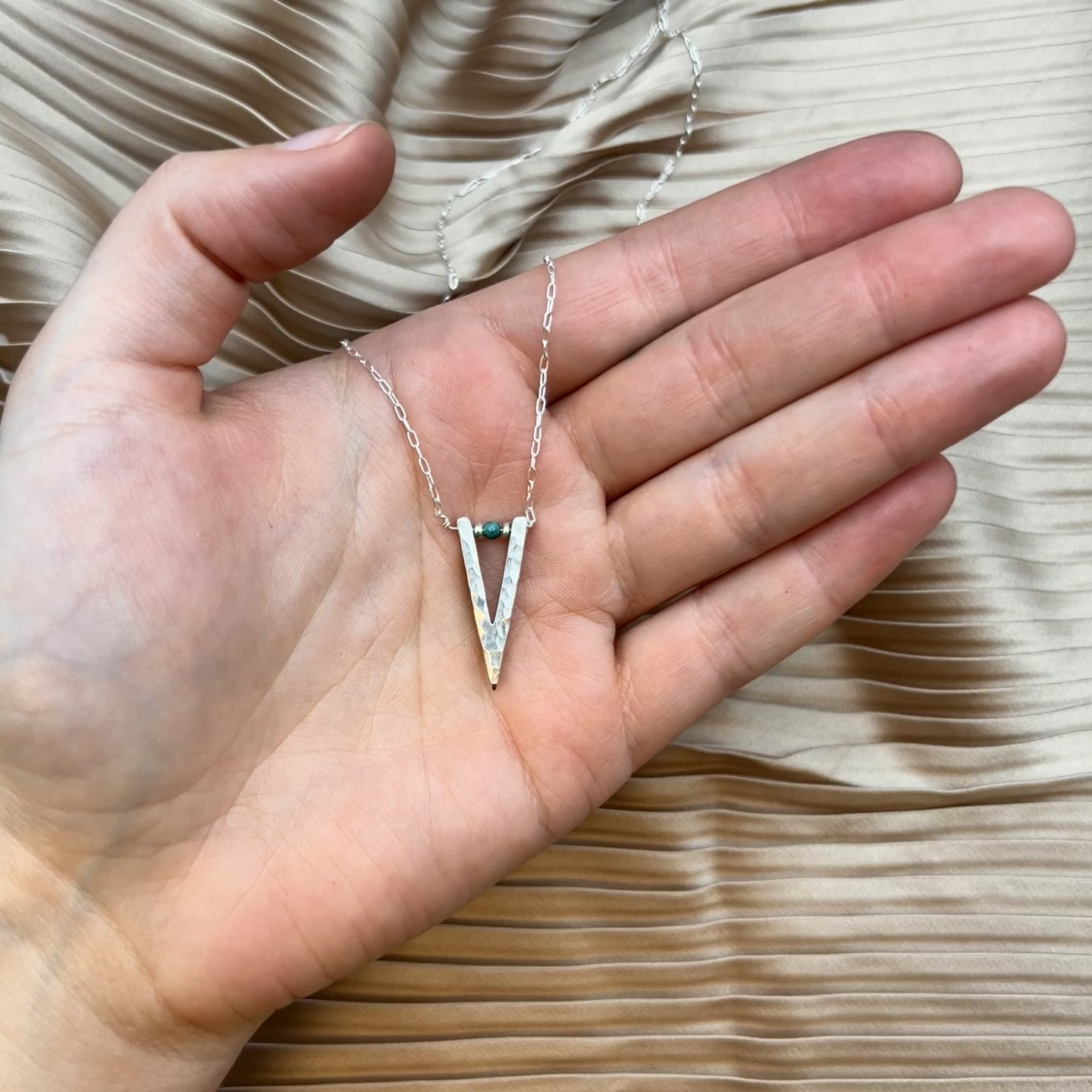 Gold or silver V pendant with a turquoise bead that hangs from a sterling silver or 14 karat gold filled chain. Turquoise bead color varies.