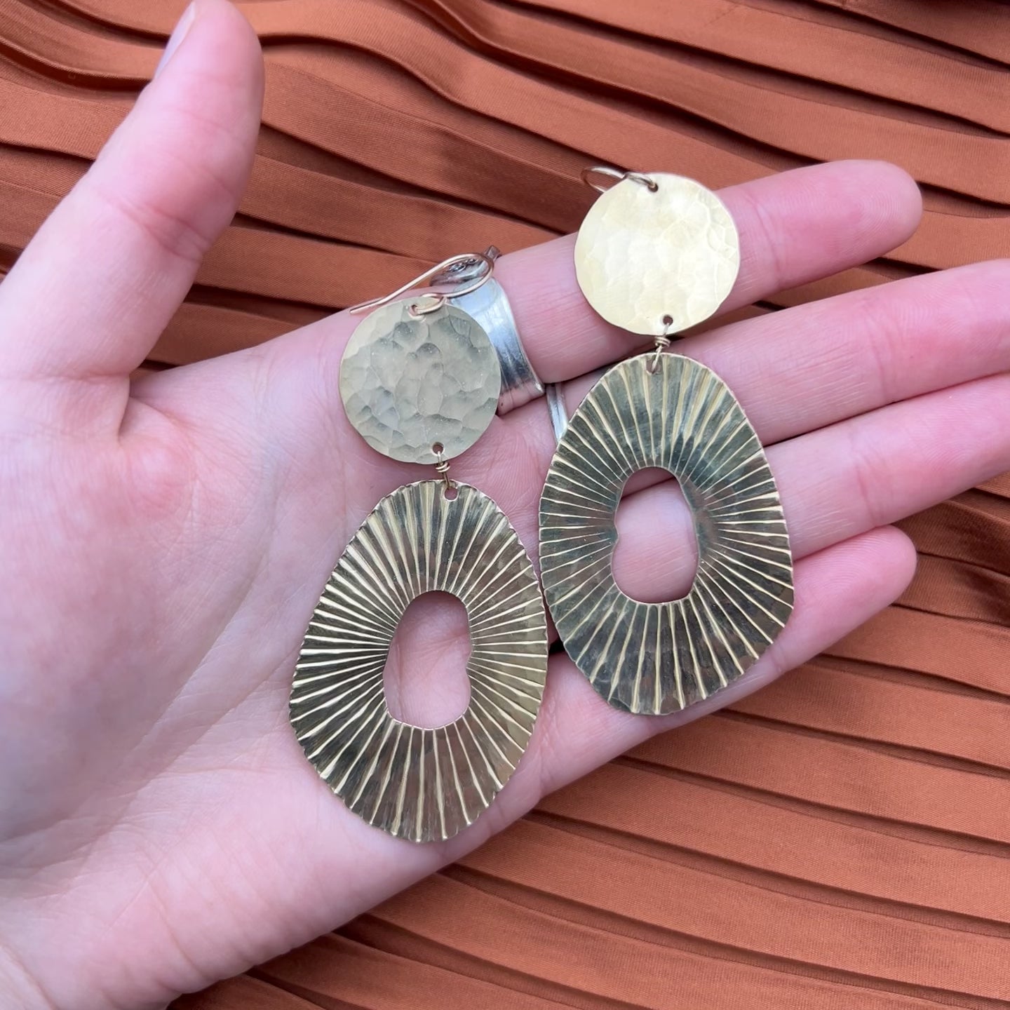 Ear wires and necklace chains are hypoallergenic and are sterling silver or 14 karat gold filled. Gold and silver pendant pieces are made of raw brass or sterling silver plated brass and can be polished the same as all other precious metals.