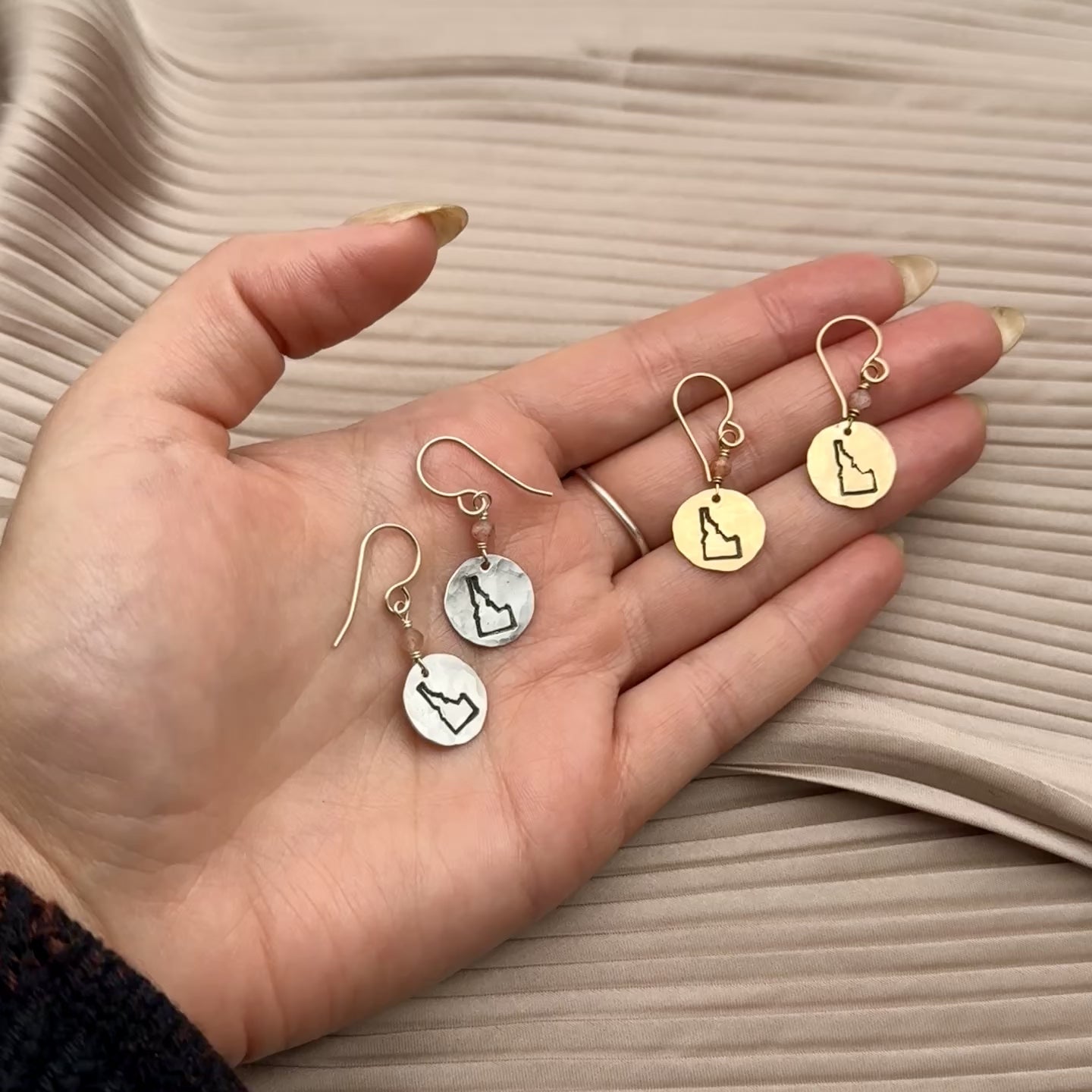 Gold or silver Idaho stamped pendants with a rose quarts faceted bead that hang from 14 karat gold filled or sterling silver ear wire.
