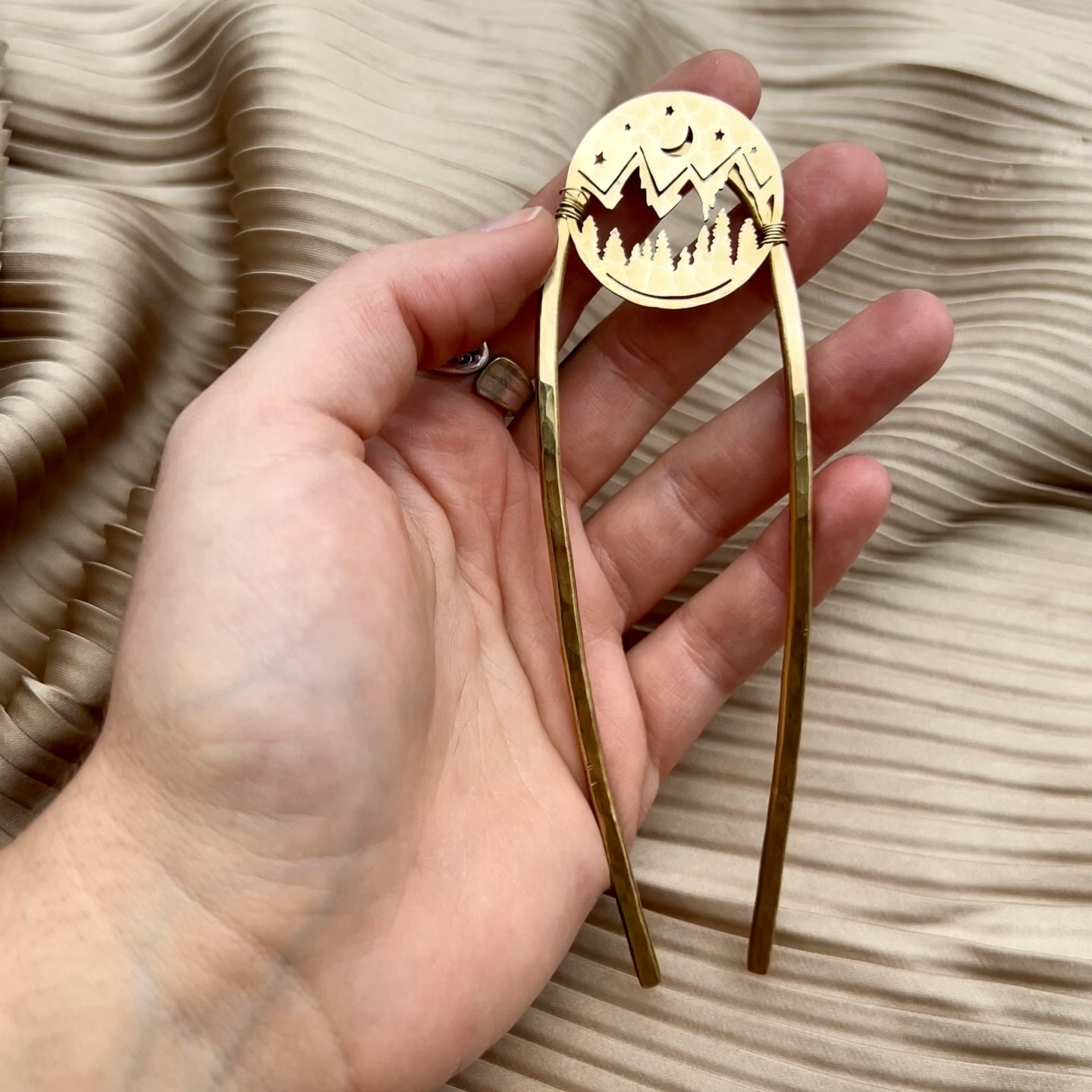 Raw textured brass mountain scene sits atop a textured brass hair fork. Available in short or long lengths. (Long pictured)