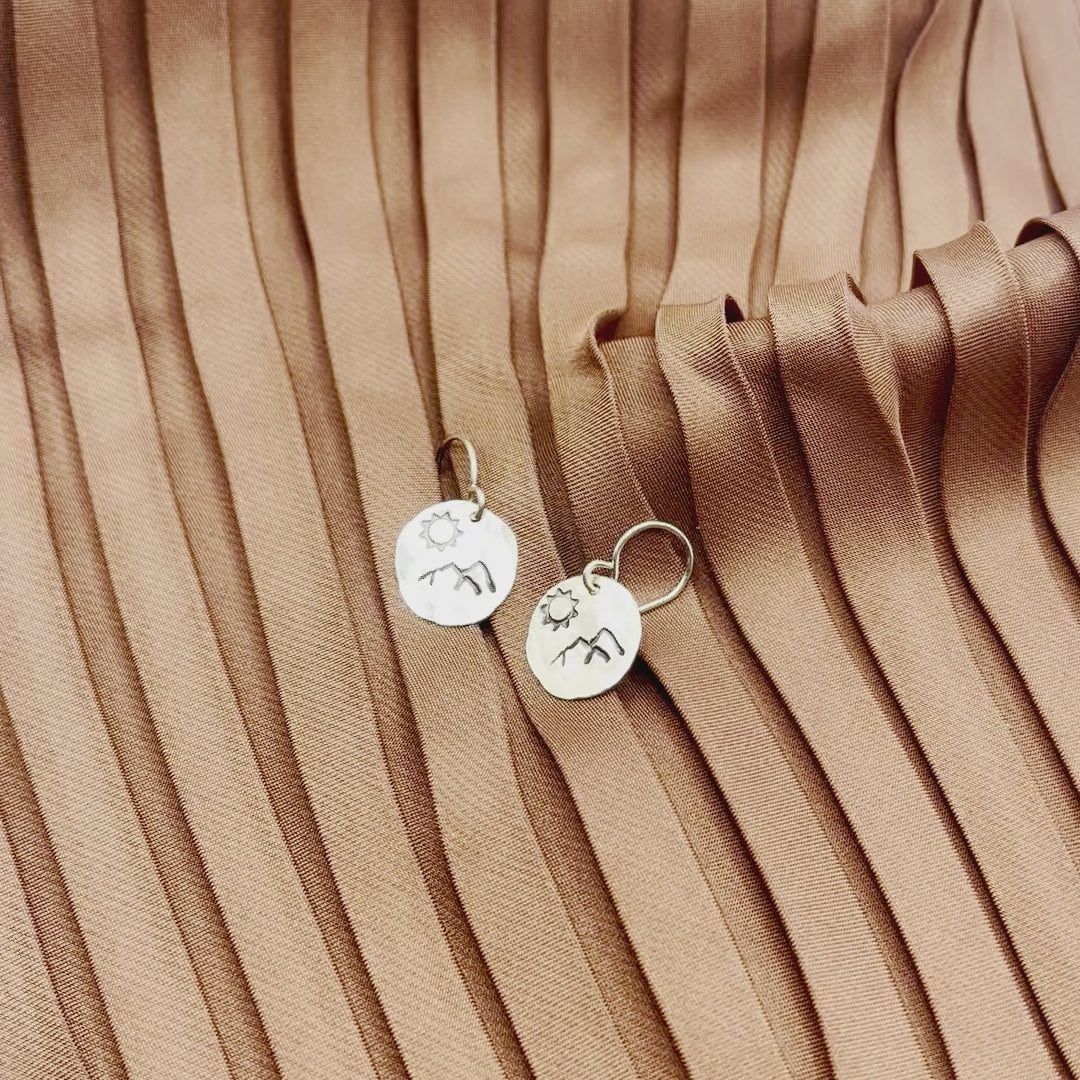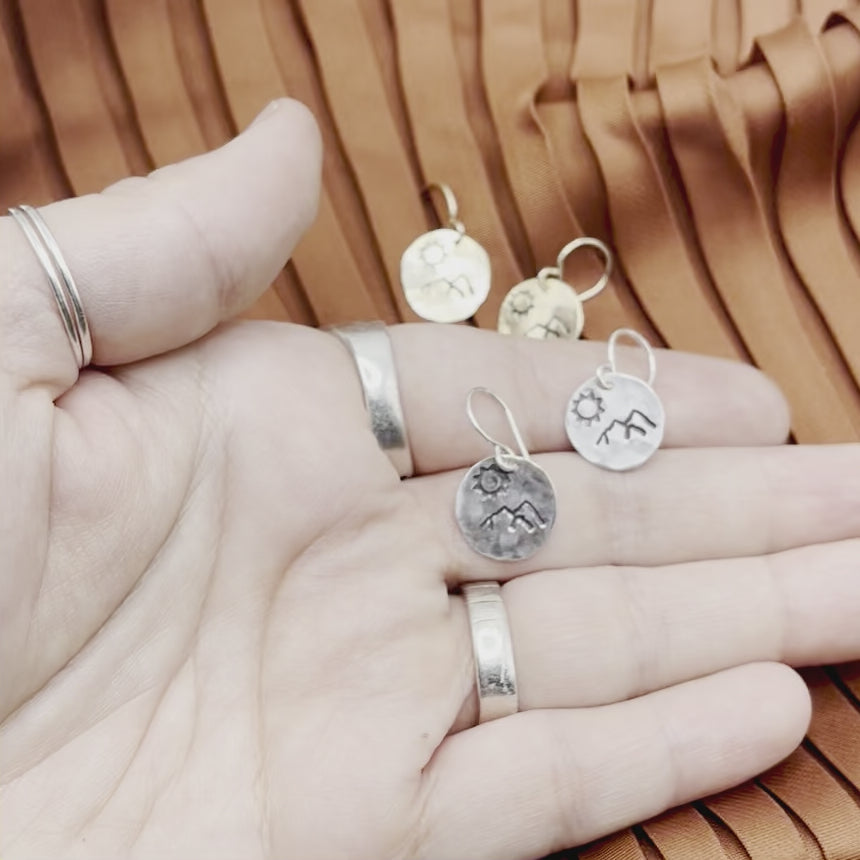 Hand stamped and textured gold or silver little pendants hang from 14 karat gold filled or sterling silver ear wire.