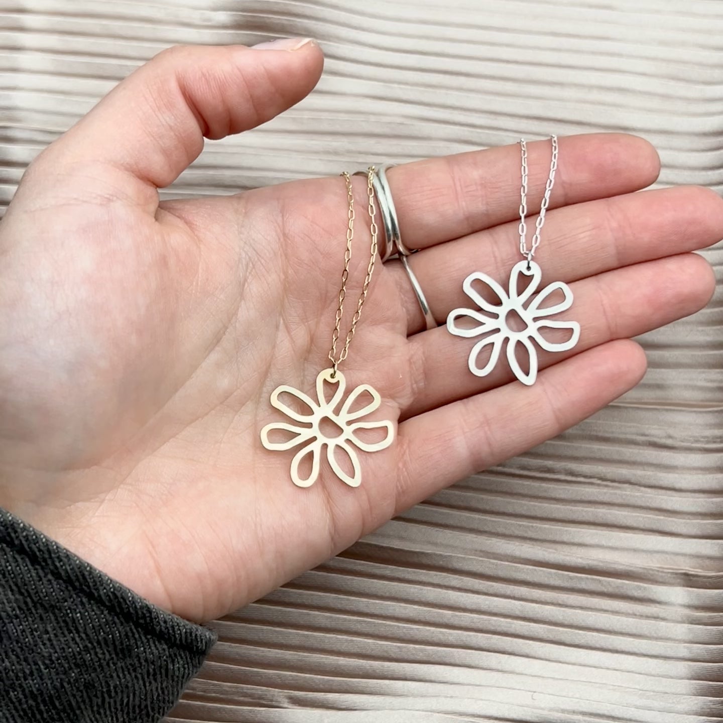 Gold or silver floral pendant that hangs from a 14k gold filled or sterling silver chain. Offered in various lengths. Matching earrings available!